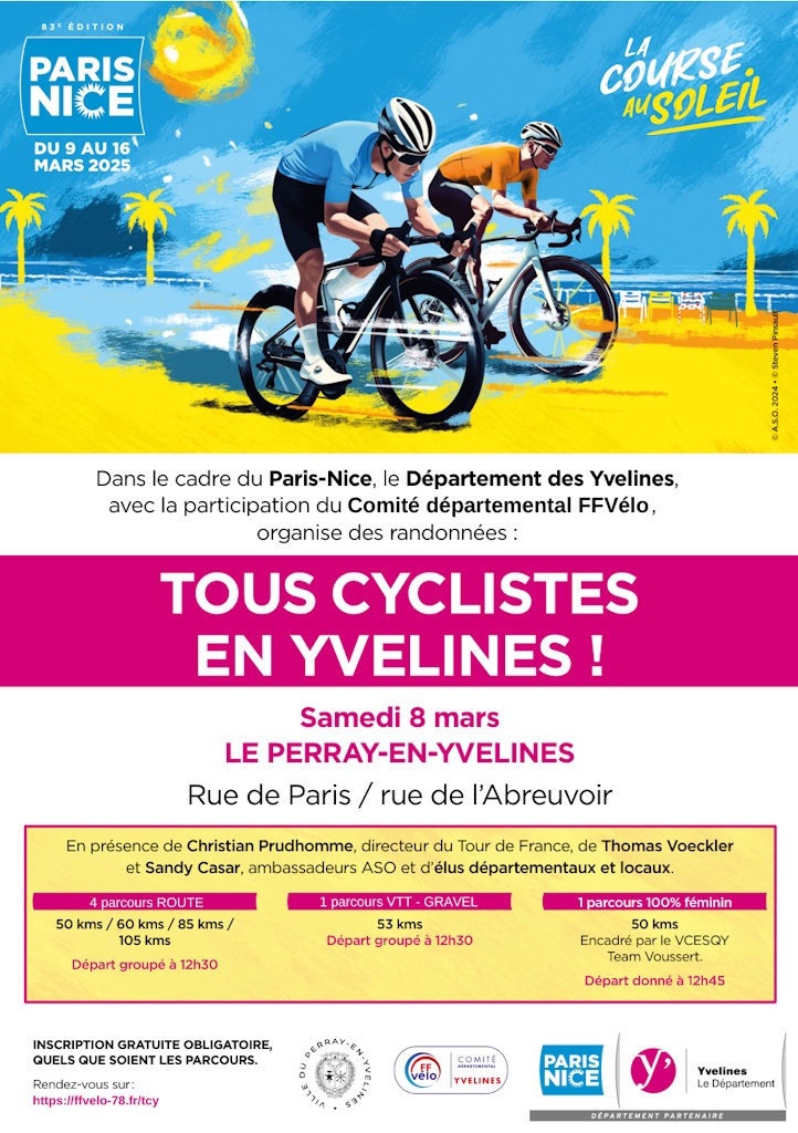 Cette année, l’édition 2025 de « Tous cyclistes en Yvelines » a eu lieu à Le-Perray-en-Yvelines le samedi 8 mars 2025.